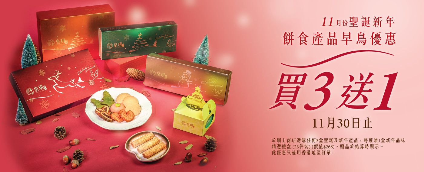 節日系列優惠 — 買 3 送 1優惠,於皇玥網上商店選購任何3盒聖誕、新年及節日限定產品,可獲贈1盒「新年品味精選禮盒」(價值$268)。